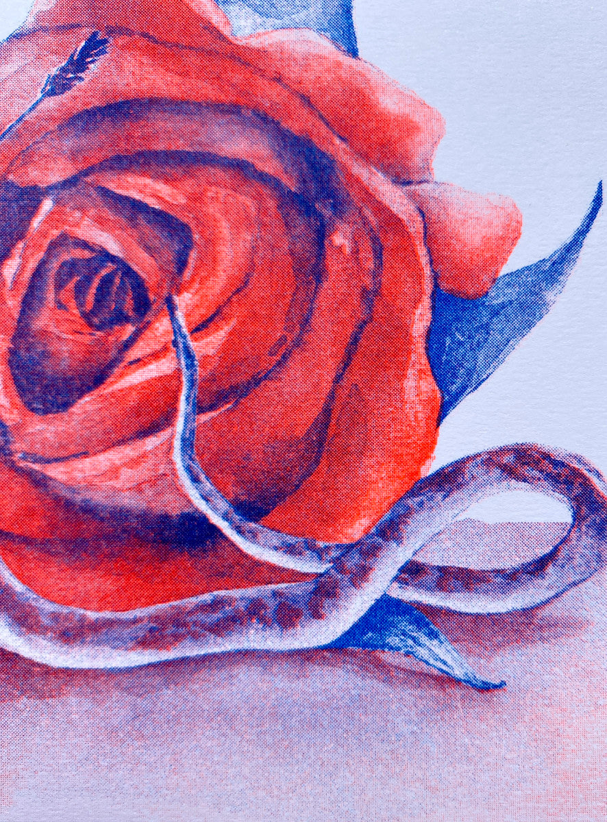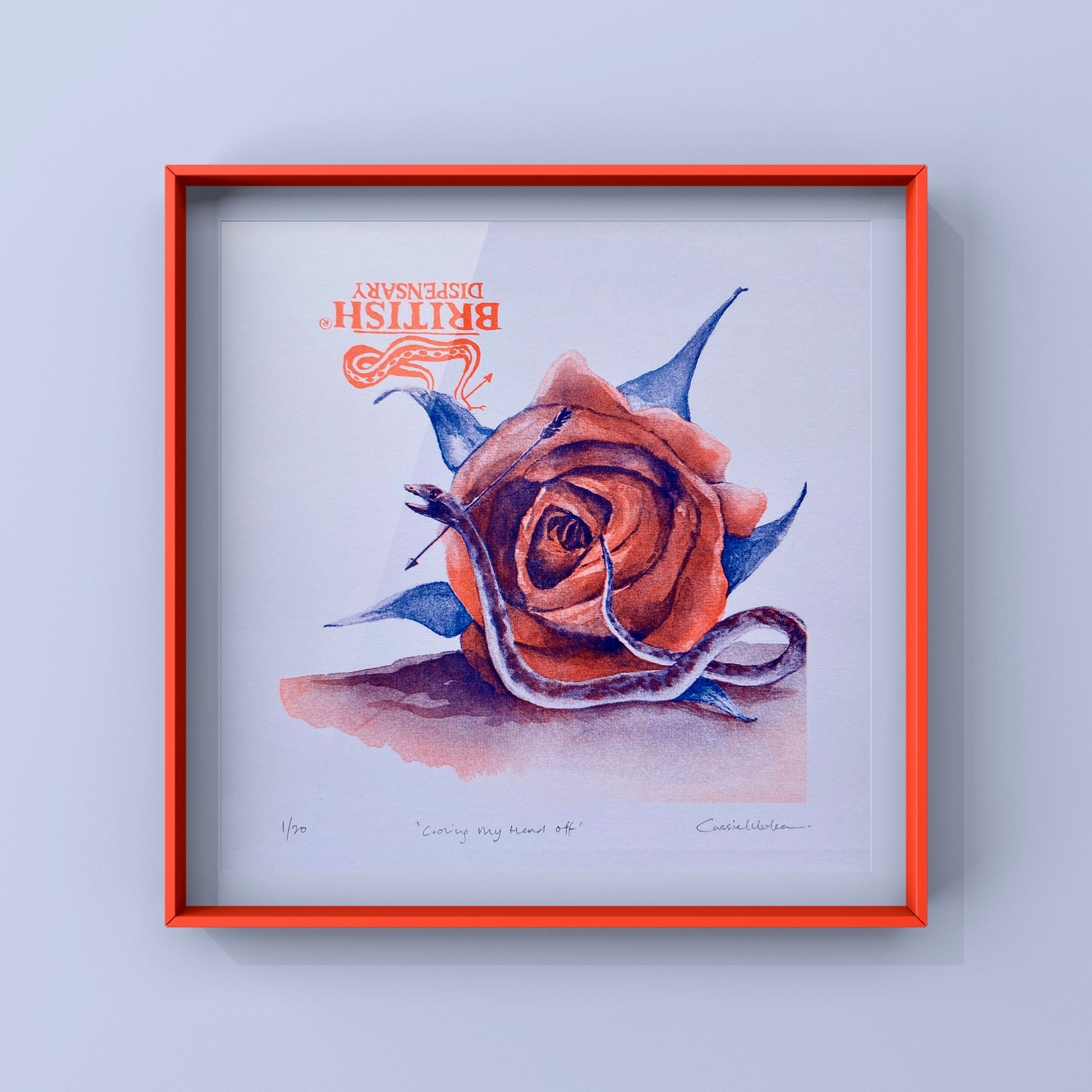 The original artwork is a traditional watercolour painting. This limited Risopgraph print consists of 2-colour (Fluorescent Orange and Blue) Riso ink, on Summer Brilliance 150gsm acid-free paper.