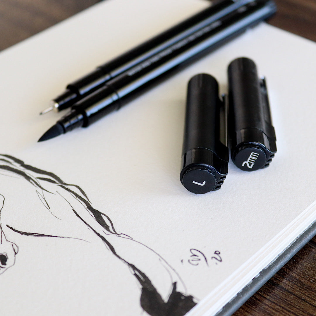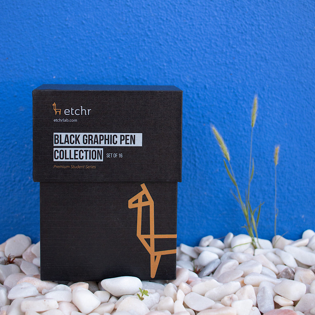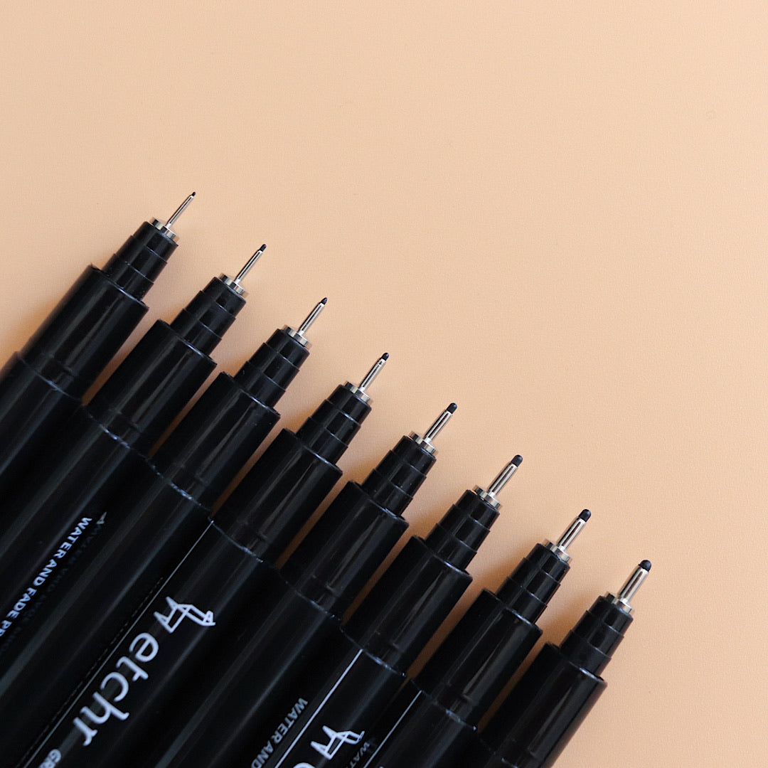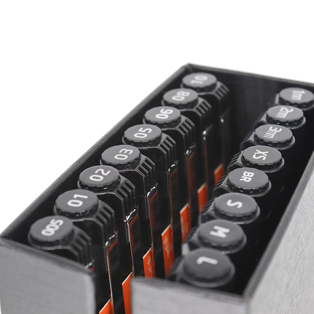 This set includes 16 pens with black water and fade proof ink. Sizes included: needle tip in 005, 01, 02, 03, 05, 06, 08, and 10; chisel tip in 1mm, 2mm and 3mm; bullet tip in XS, S, M, and L; and BR (brush). Nibs made in Japan.