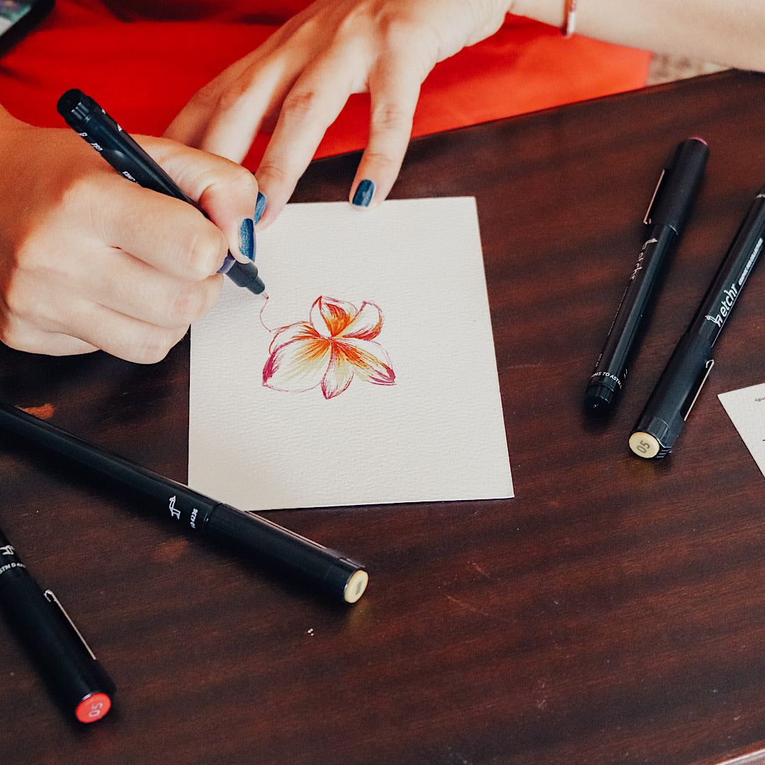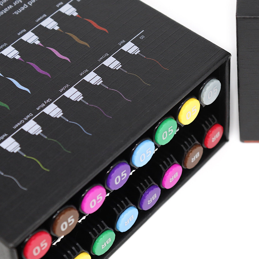 Set of 16 coloured ink fineliner and brush pens. Water based pigment ink for waterproof and fade proof lines.