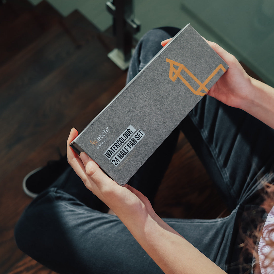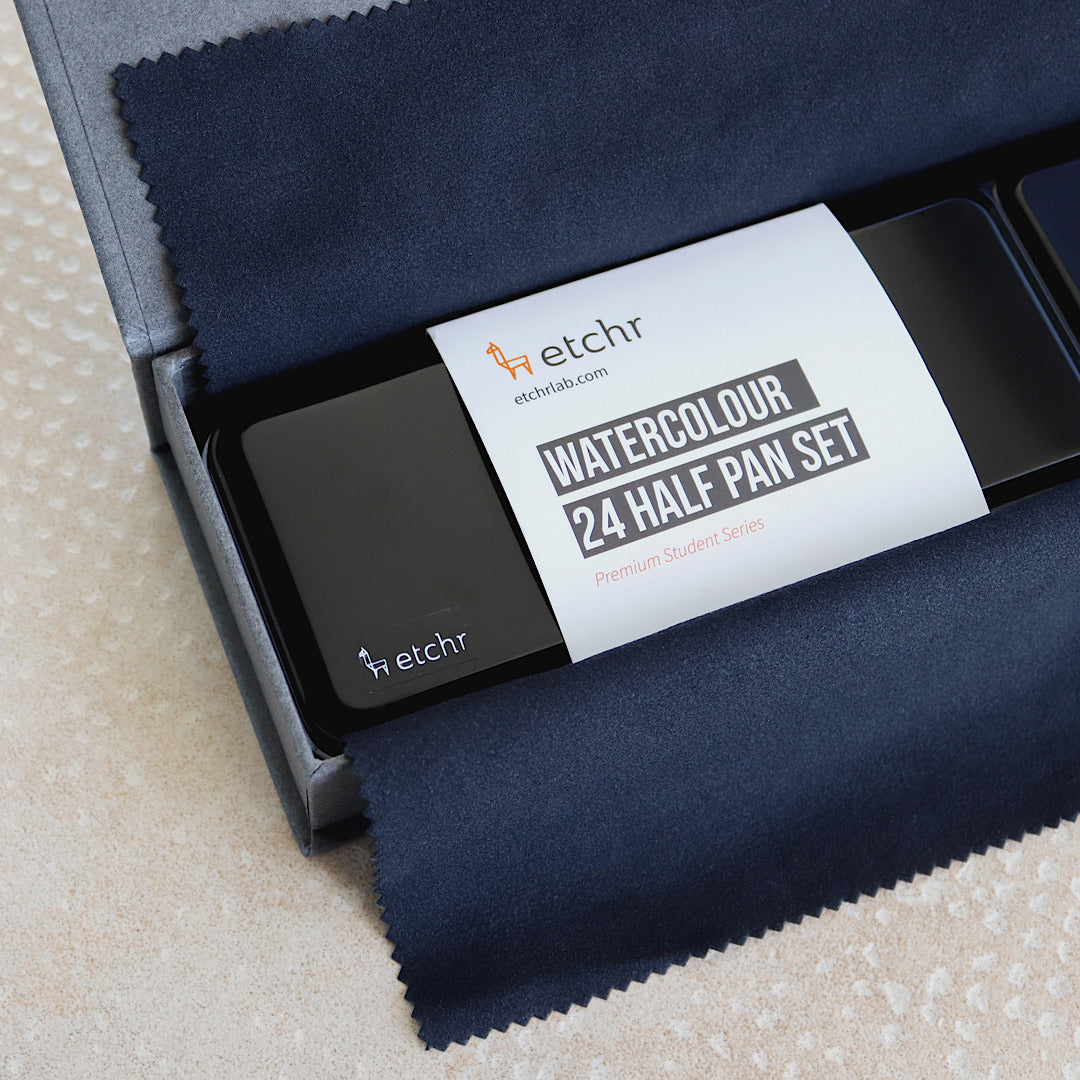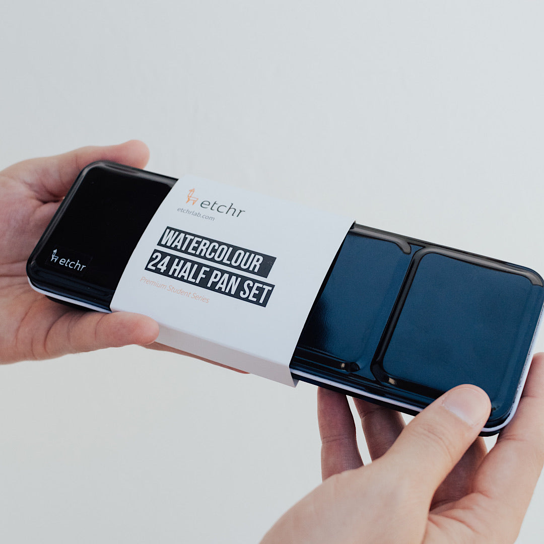 Hand-picked vegan friendly watercolours in a set of 24 half pans. Premium student grade colours. Half pans come in inside a black metal box for easy carry, a swatching paper, and a durable outer box for safe packaging and delivery.