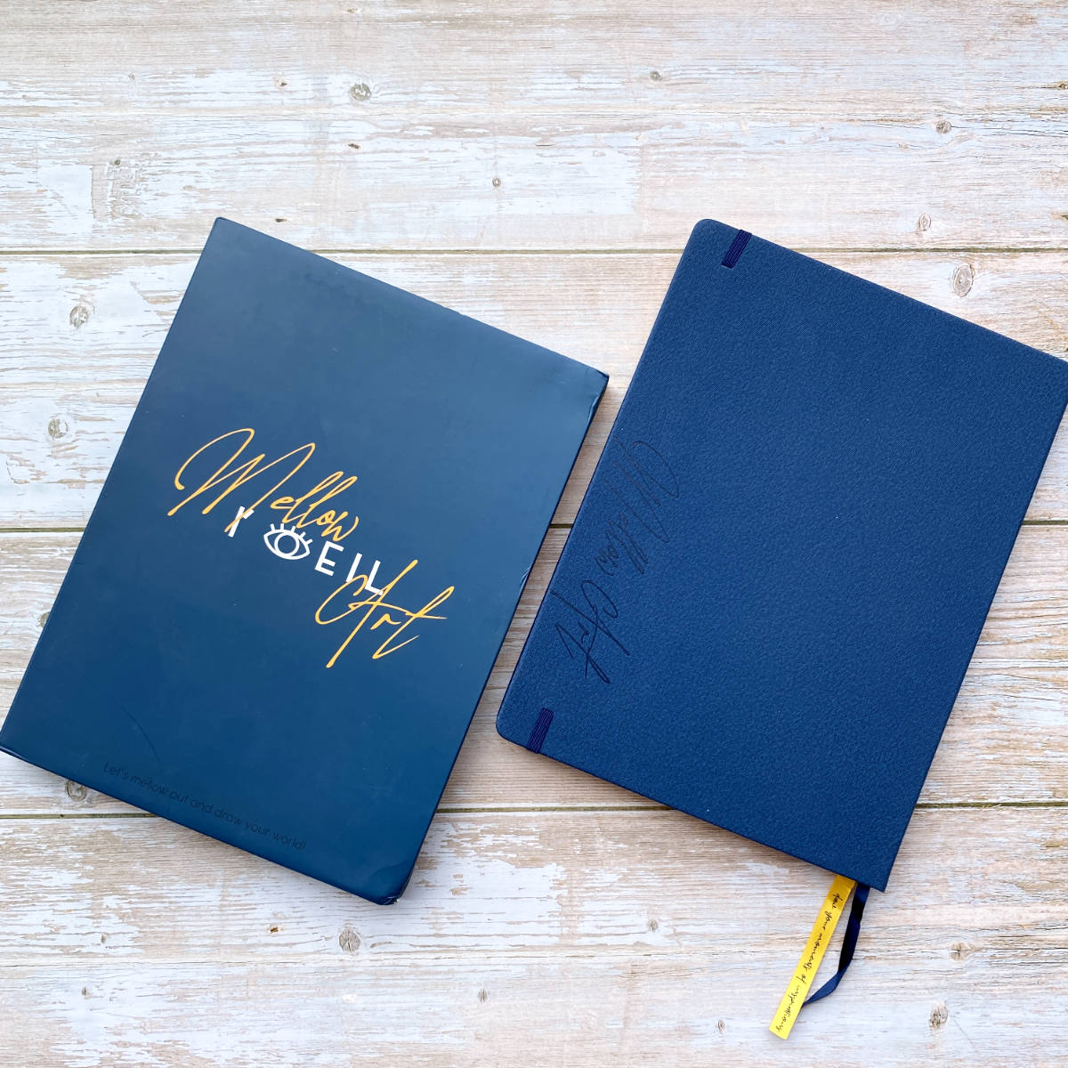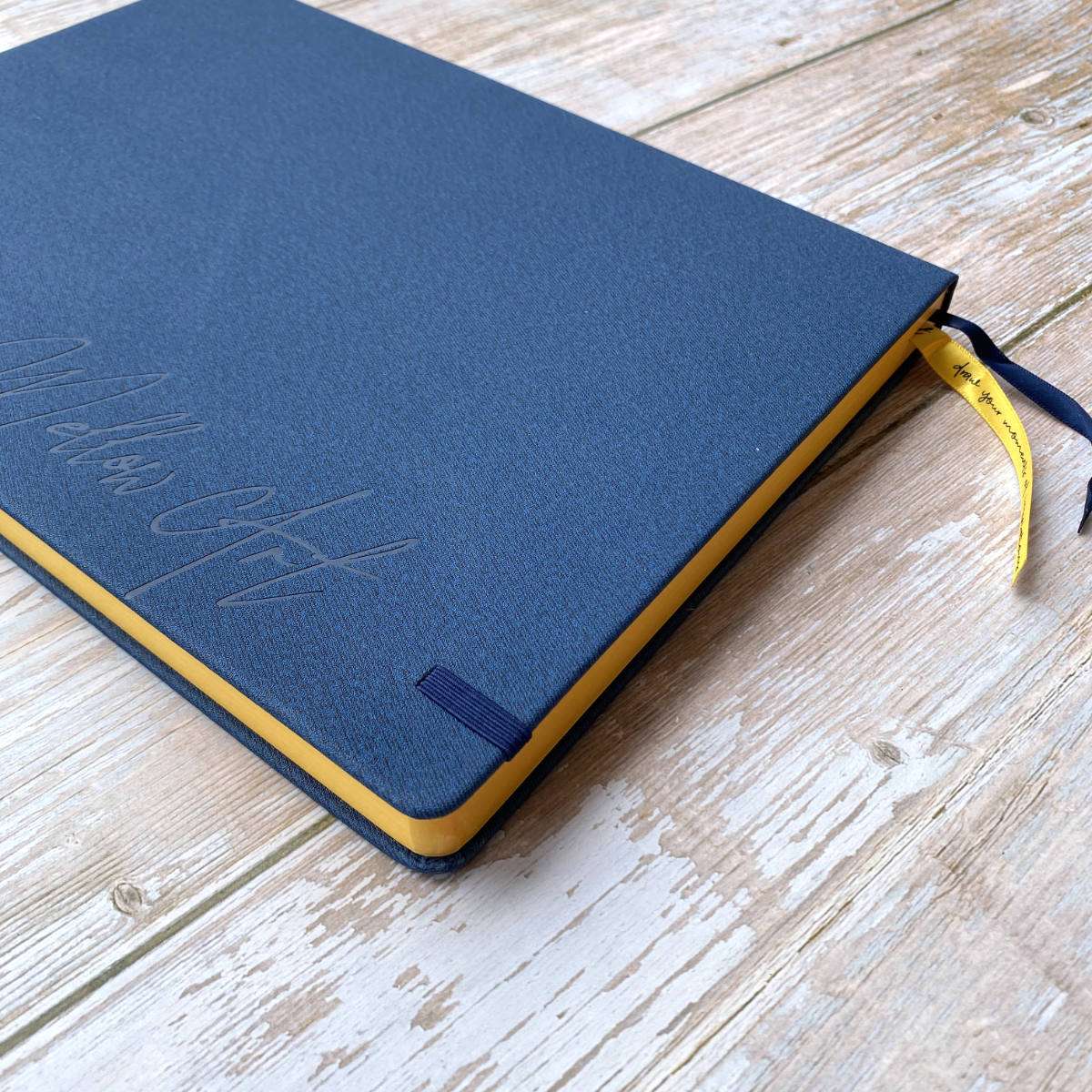 - Cover: Hardcover with navy blue PU leather and de-bossed logo at the back cover