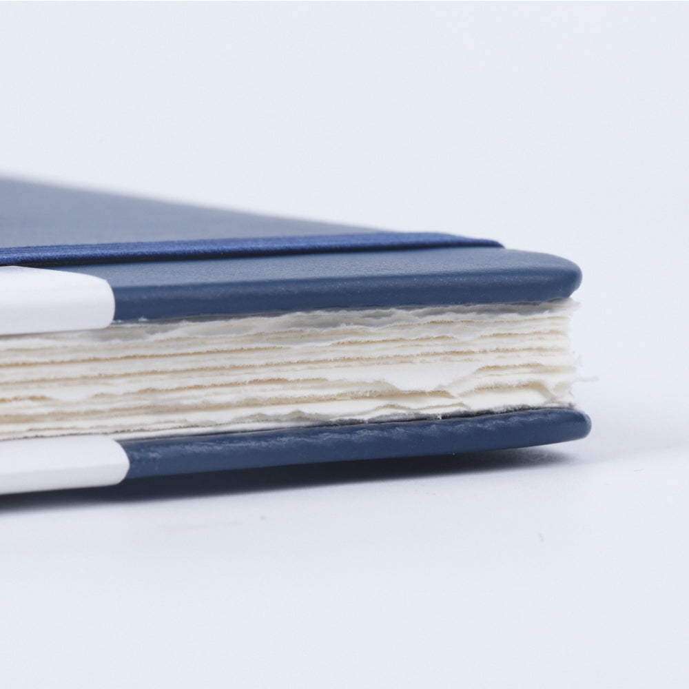 The 44 pages feature deckle & hand-torn edges that accentuate the natural look and feel of the cotton paper. The sketchbook is casebound and glue-reinforced with a faux-leather PU cover.