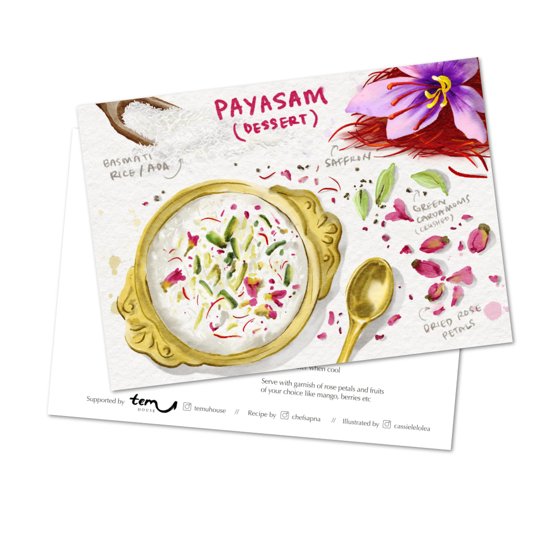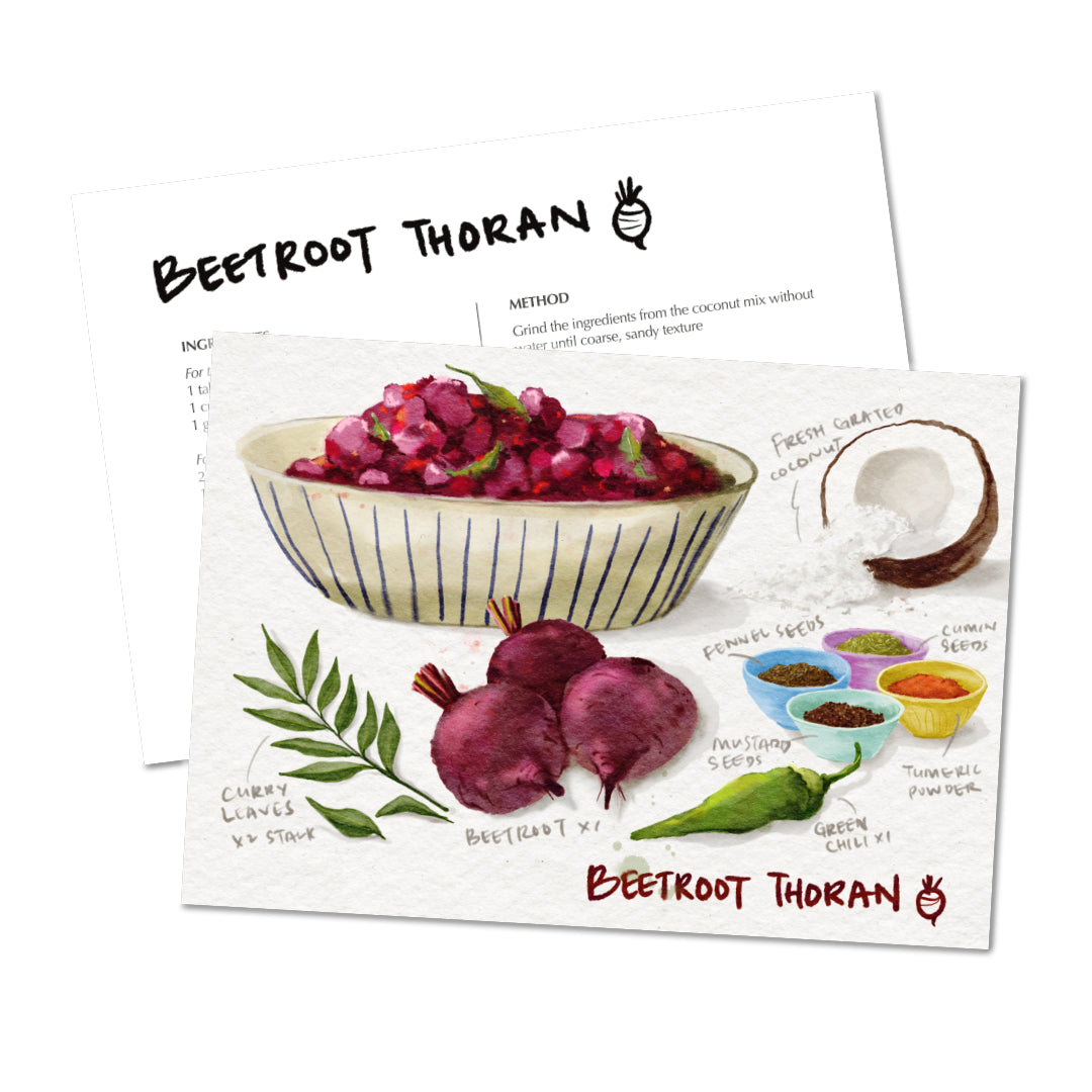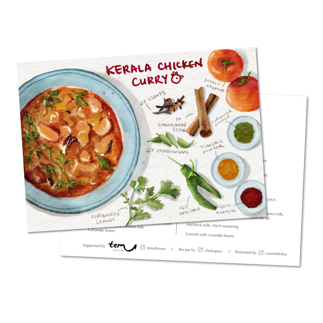 Discover the vibrant flavours of Kerala with this beautifully illustrated set of recipe cards. Featuring five exquisite recipes by Chef Sapna, each card is brought to life with Cassielelolea’s watercolour illustrations.